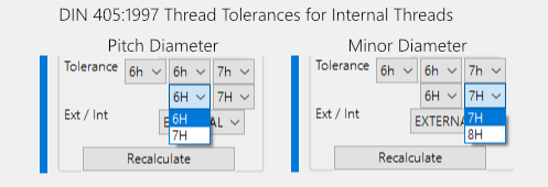 When switching between External and Internal thread, you might get red alert boxes around the machining diameters, press the recalculate button again to correct the mean machining diameters.