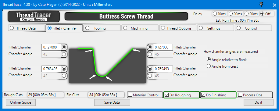 Fillet/Chamfer : Value here is the calculated radius/chamfer for the thread defined in Tab 1.