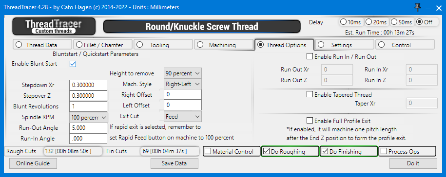 Enable Blunt Start : This will enable Blunt Start threads to be calculated when pressing the Do It button. All machining will be done with the same tool as the main thread ( as defined in Tooling tab ).