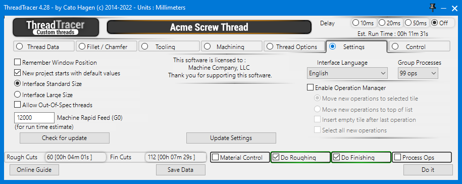 Machine Rapid Feed : Enter the rapid feed the machine travels at. This number is only used for more accurate calculaton of run time for the thread.